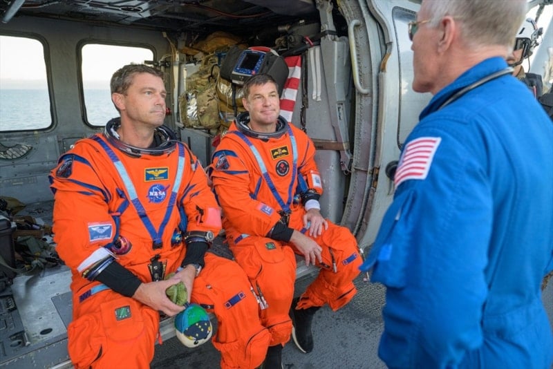 Önce botlara alınan astronotlar, daha sonra helikopterle yakında bekleyen bir gemiye getirildi.