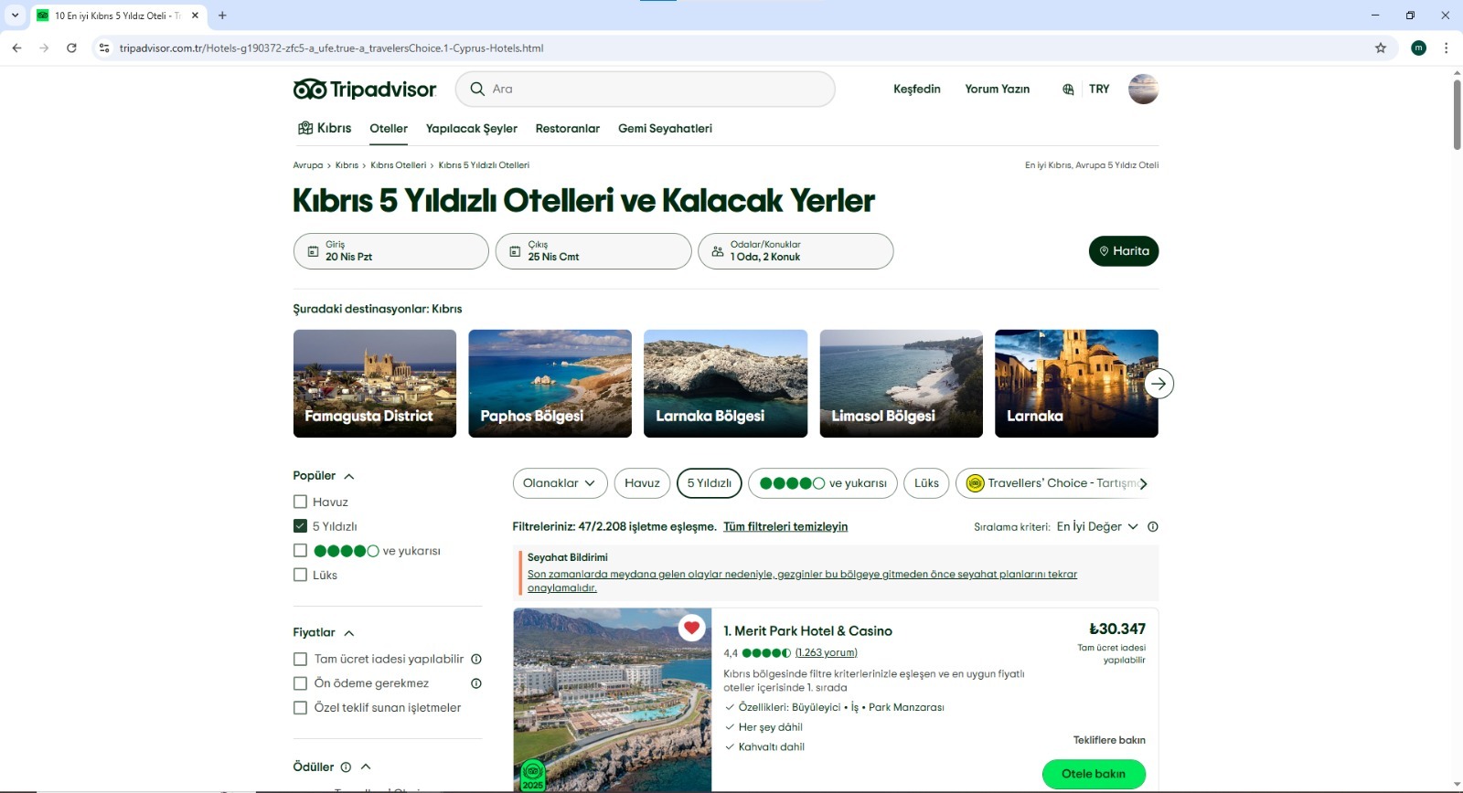 Travelers’ Choice Awards ödülleri, son 12 ay içerisinde Tripadvisor platformu üzerinden yapılan gerçek misafir yorumları ve puanlamaları doğrultusunda verilmektedir. Bu kapsamda Merit Park Hotel & Spa; misafir memnuniyetine verdiği önem, yüksek hizmet kalitesi ve kusursuz deneyim anlayışıyla öne çıkarak Kuzey Kıbrıs beş yıldızlı otelleri arasında ilk sırada yer aldı ve alanındaki başarısını bir kez daha tescilledi.