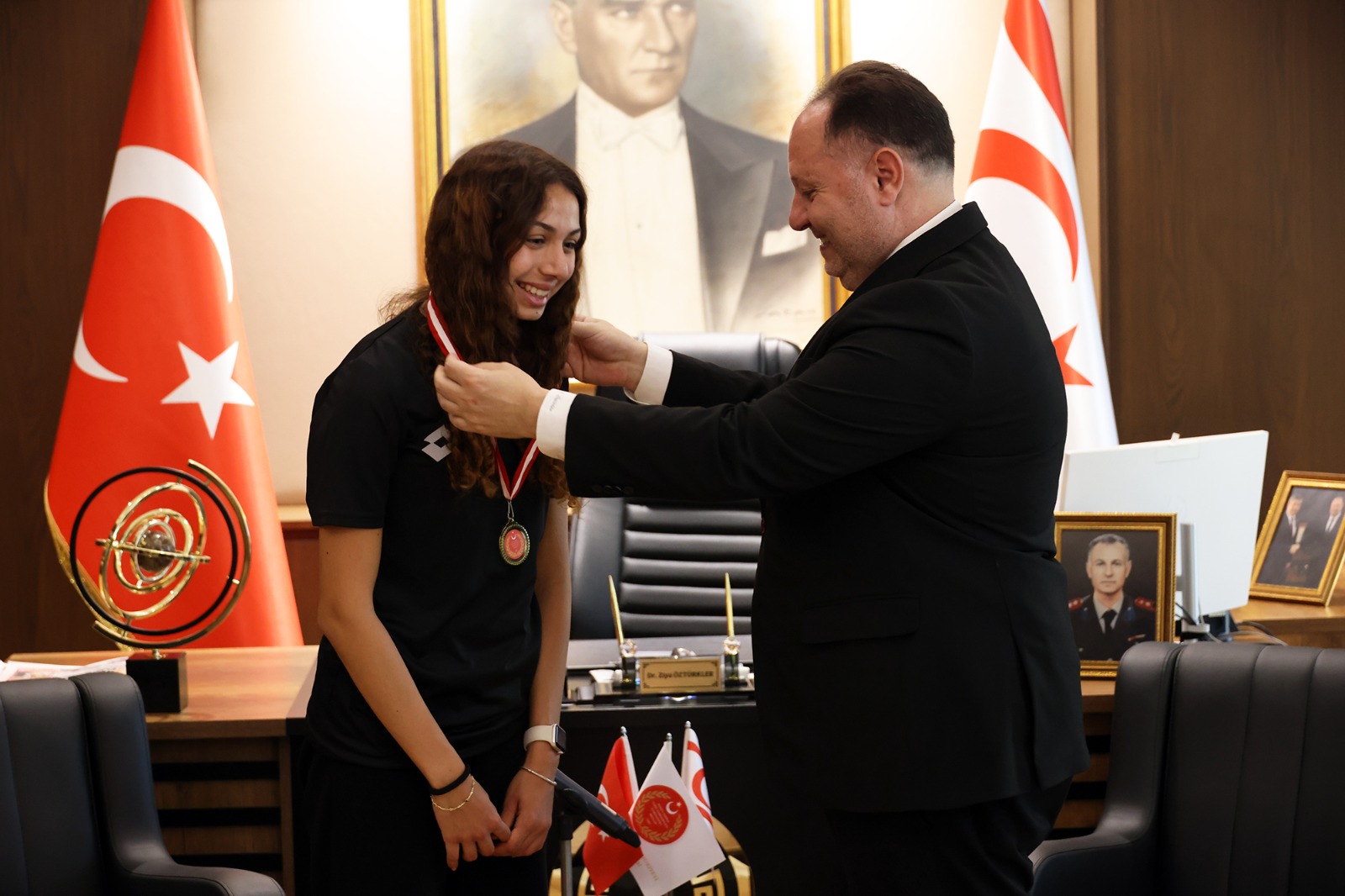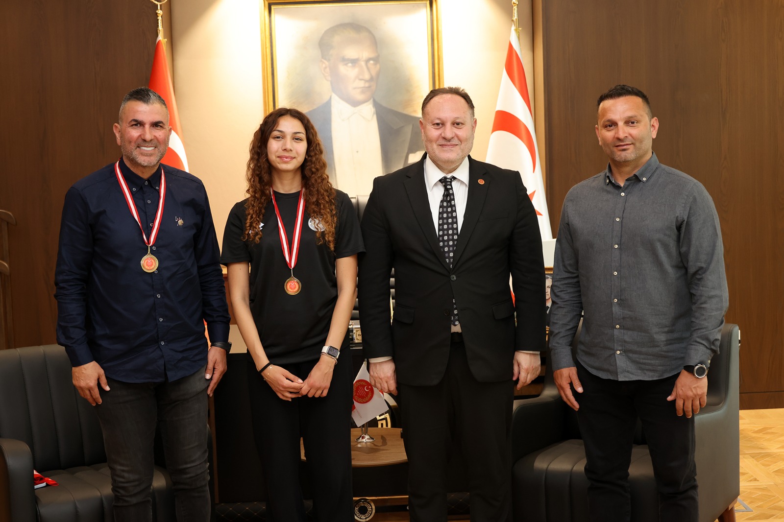 Başkan Öztürkler kabulde, başarılı sporcu Ada Kafa ve antrenörü Hasan Maydo’ya Meclis anı madalyası verdi.
